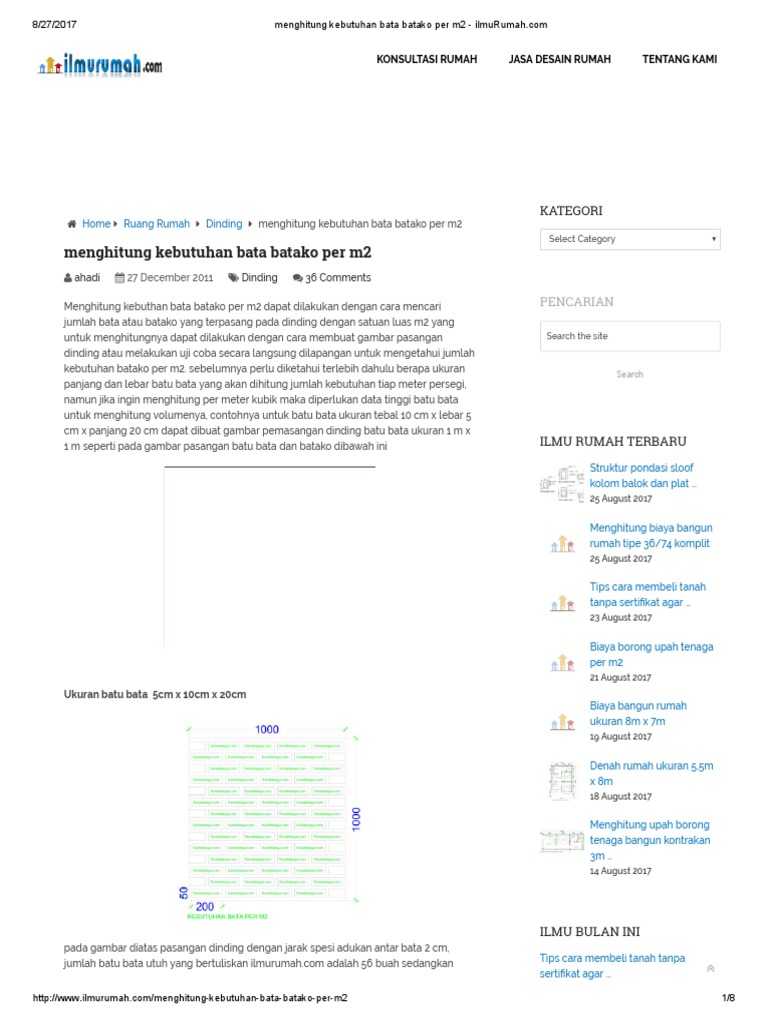 Untuk material lainya dengan ukuran berbeda seperti selcon atau batu bata yang dipesan dengan ukuran khusus maka dapat dihitung dengan langkah seperti diatas, untuk mengetahui total kebutuhan batu bata pada sebuah rumah maka dapat dihitung. Batu bata umumnya digunakan sebagai bahan baku utama untuk membuat dinding dari suatu bangunan. Kisaran harga batako putih per biji hanya rp. Harga borongan bangunan per meter persegi juga dipengaruhi oleh pekerjaan yang akan dilakukan. Untuk material lainya dengan ukuran berbeda seperti selcon atau batu bata yang dipesan dengan ukuran luas 27 m2 maka kebutuhan batu bata untuk dinding tersebut adalah 27 m2 x 63 bh = 1701 bh.