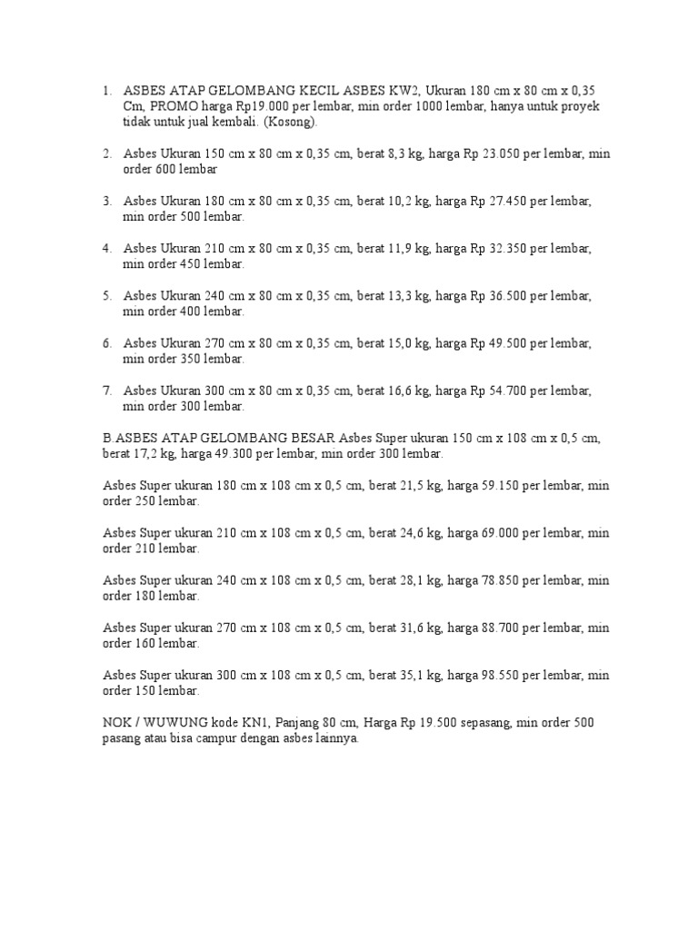Daftar Harga Material Desember Asbes 240 Rp 78 000 Lembar 12 Atap Kanolite 150 Rp 54 000 Lembar Pdf Document from demo.fdokumen.com Asbes terdiri dari partikel berukuran mikro yang tentu saja tak terlihat oleh kasat mata. Harga asbes di pasaran memiliki kisaran dari rp33.000 hingga rp83.000 per lembarnya. Selengkapnya cek di infoharga.id ya. Semakin besar dan tebal jenis asbes yang dipilih, maka harganya pun semakin mahal. Tersedia banyak ukuran yang bisa anda pilih. Karena sebelum membangun pun, anda tentunya sudah harus merencanakan lebih dulu. Cek ⏩ promo harga asbes terbaru ukuran asbes plastik bening dan asbes gelombang besar/ kecil. Harga asbes yang terjangkau menjadikan material ini sangat diminati untuk renovasi rumah.